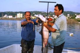 Eynesilli balıkçılar Karadeniz’de dev köpekbalığı yakaladılar.![]() 24/06/2012 Eynesil'de Köpek balığı yakaladılar Eynesilli balıkçılar Karadeniz’de dev köpekbalığı yakaladılar. Eynesil Liman balıkçılarından Alver kardeşler sabah mezgit avı için çıktıkları Karadeniz’de ağlarına köpekbalığı takıldığını görünce şok olduklarının söylediler. Yakaladıkları köpekbalığının 500 liralık ağlarına zarar verdiğini söyleyen Ali Alver (44) “Karadeniz’de ender rastlanan köpek balığı ve iki yavrusuyla ağlarımıza takıldı. Ağı yarım saatte zor temizledik. Bize zararı 500 lira. Yakaladığımız köpek balığını boyu 1,5 metre ve 22 kilo ağırlığında” dedi. ![]() . ![]() . ![]() . ![]()