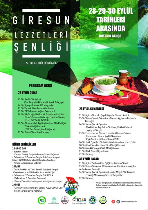 3 GÜN SÜRECEK "GİRESUN LEZZETLERİ ŞENLİĞİNE" DAVETLİSİNİZ...![]() 24/09/2018 Giresun lezzetlerini koruma altına almak, tanıtmak ve yemek kültürümüze sahip çıkmak amacıyla ilimizde bulunan tüm paydaşların katılımıyla “Giresun Lezzetleri Şenliği” düzenleniyor. Giresun Valiliğinin himayelerinde; İl Özel İdaresi, İl Kültür ve Turizm Müdürlüğü, İl Milli Eğitim Müdürlüğü, Giresun Turizm Altyapı Hizmet Birliği, Ticaret ve Sanayi Odası ve GESOB’un katkı ve koordinasyonu ile düzenlenecek olan “Giresun Lezzetleri Şenliği” 28–29–30 Eylül 2018 tarihleri arasında Giresun Gemilerçekeği Mahallesi Yalı Mevkiinde bulunan Botanik Bahçe içerisinde yapılacak. 28 Eylül Cuma günü 13.30’da “Şenlik Yürüyüşü” ile başlayacak olan “Giresun Lezzetleri Şenliği” 3 gün boyunca zengin içeriklerle devam ederek, 30 Eylül Pazar günü saat 17.00’de sona erecek. Etkinlik süresince; Giresun mutfak kültürünün ve yemeklerinin tanıtımı yapılarak, sanat sergileri, Türk müziği konserleri ve eğlenceli etkinliklere yer verilecek. Programının ilk günü Debboy Mevkiinden Botanik Bahçeye kadar “Şenlik Yürüyüşü” ile başlayacak ardından Botanik Bahçe’de yapılan protokol konuşmaları ile devam edecek. Botanik Bahçe’de bulunan yemek stantlarının gezilmesinin ardından saat 15.30’da metrelerce uzunluğunda “DEV Giresun Yağlısı” gösterisi yapılacak. Dünyanın en önemli mutfak kültürü yarışması 'Basque Culinary World Prize'da (Bask Dünya Aşçılık Ödülleri) yarışmasında 140 şef arasından ikinci kez finale kalarak, dünyanın en iyi 10 şefinden biri olan sosyal girişimci Ebru Baybara Demir’in “Geleceğe Bırakacak Emanetlerimiz Var Bizim” konulu gıdanın geleceği üzerine yapacağı söyleşinin ardından akşam saat 19.00 da TRT Saz Sanatçıları eşliğinde, Giresun Halk Eğitim Merkezi Müdürlüğü tarafından “Türk Müziği Konseri” verilecek ve ilk günkü program saat 22.00’de düzenlenecek plaket töreni ile son bulacak. 29 Eylül Cumartesi günü saat 11.00’de Tirebolu Çayı eşliğinde “Giresun Simidi” ikramı ile başlayacak olan ikinci gün etkinlikleri; Giresun Aşçılar ve Pastacılar Derneği tarafından “Yemek Sanatı Gösterimi”, çocuklara yönelik olarak “Meddah ve İbiş, Balon Sihirbazı, Kukla Gösterisi, Hoptiç ve Topçik” gibi sahne oyunları, Ekoturizm ve Giresun Lezzetleri üzerine söyleşi, halk oyunları gösterisi devam edecek. İkinci gün etkinlikleri akşam saat 18.30 da Giresun Güzel Sanatlar Lisesi, saat 20.00’de ise Giresun Musiki Cemiyeti tarafından verilen Türk Müziği Konserinin ardından saat 21.30’da “Dilek Feneri” uçurulması ile sona erecek. Şenliğin son günü olan 30 Eylül Pazar günü açılış yine saat 11.00’de Tirebolu Çayı eşliğinde “Giresun Simidi” ikramı ile başlayacak, saat 13.00’de Giresun Aşçılar ve Pastacılar Derneği tarafından düzenlenecek “Yemek Yarışması” ile devam ederek saat 14.00 de ise çocuklara yönelik sahne oyunları ve çeşitli yarışmalara yer verilecek. Şenlik kapsamında düzenlenecek diğer etkinlikler ise şöyle; 28 Eylül Cuma günü Doğa Koruma ve Milli Parklar Şube Müdürlüğü tarafından “Tabiat ve Yayla Temalı Fotoğraf Sergisi” ile Sanatçı Filiz Uzun tarafından “Geleneksel El Sanatları Sergisi” açılarak, Halk Eğitimi Müdürlüğü tarafından “Giresun” temalı resim yarışması düzenlenecek. 29 Eylül Cumartesi günü Leyla Aliyeva’nın kişisel resim sergisi ile GEZFOD ve GİFOD tarafından “Giresun” temalı karma fotoğraf sergisi açılacak. Yine “Giresun Lezzetleri Şenliği” etkinliği çerçevesinde 28–29–30 Eylül tarihlerinde, üç gün boyunca “Bereket Kazanı” adı ile Çavuşlu Ekmeği ile pancar çorbası dağıtılarak, yemek sunumları ve satışları yapılacak. Tulu Sanat Atölyesi tarafından da üç gün boyunca geleneksel el sanatlarının yer aldığı bir sergi açılacak. Kaynak : Giresun Valiliği Basın Yayın... ![]() |