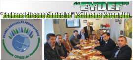 Eydef "Feshane Giresun Günleri’ne" Katılmıyor.. Eydef (Giresun Eynesil Dernekler Federasyonu) Gaziosmanpaşa’daki Merkez binasında yaptığı toplantıda, “Feshane Giresun Günleri’ne” katılmama kararı aldığını açıkladı. ... Eydef Başkanı Mehmet Halil HAYTA yaptığı açıklamada, “Federasyonumuza bağlı derneklerimiz var. Oturup konuştuk. Geçmiş yılları tahlil ettik. Yaptığımız masrafa baktık.Feshane’nin getiri ve götürülerini enine boyuna detaylıca tartıştık. Sonuç itibariyle, yönetim kurulu üyelerimiz ile dernek başkanlarımız bu yıl oy birliği ile böyle bir karara vardı. Saygı duymak lazım. Tüm camiaya saygı ve başarı temennilerimizi sunarız.” Kaynak giresunhaberal.com/eynesilajans.com