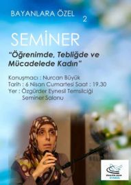 ‘Öğrenimde, Tebliğde, Mücadele Kadın’ konulu semineri Özgür-der İzmir Şube Başkanı Nurcan Büyük sunacaktır.