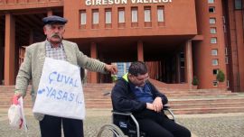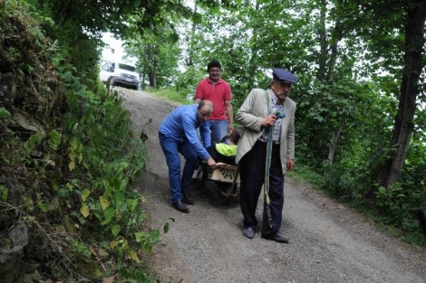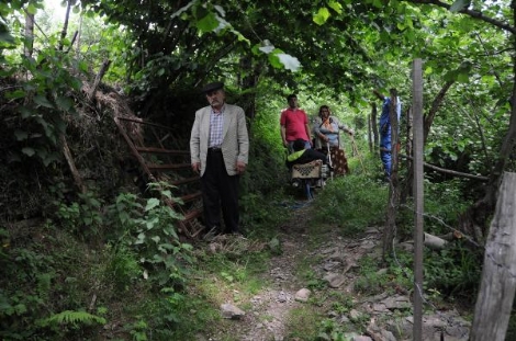 Giresun Valiliği Önünde Eylem Yaptı, Engelli Oğlu İçin Yol İstedi... 29/05/2015Giresun'da yol evine ulaşmadığı için engelli oğlunu el arabasıyla yola kadar taşımak zorunda kalan 64 yaşındaki Mustafa Bay valilik önünde eylem yaptı, yardım istedi. Duroğlu Beldesi Pınarçukuru köyünde yaşayan Mustafa Bay, özürlü oğlu 29 yaşındaki Mustafa Bay ile geldiği Giresun Valiliği önünde açıklamalarda bulundu. Yüzde 94 engelli olan epilepsi hastası oğlunu zaman zaman doktora götürmek zorunda olduğunu anlatan Mustafa Bay, evin yolunun araç geçişine uygun olmadığını, bu nedenle oğlunu engebeli arazide el arabası ile taşımak zorunda kaldığını söyledi. EV İLE YOL ARASINDA 200 METRE MESAFE VAR Ev ile yol arasında yaklaşık 200 metre mesafe bulunduğunu kaydeden Mustafa Bay, "Mevcut yol araç için uygun ancak sadece 5 metrelik bir bölümde yolun yaklaşık 35 santimetre genişletilmesi gerekiyor. Ama arazi sahipleri yer vermiyor. Yıllardır bu yolun genişletilmesi için uğraşıyorum ama olmadı. Eski Vali Dursun Ali Şahin girişimde bulundu ama sorunu çözemeden arkadaşın biri onu sürdürdü. Çözüm arıyorum ama sonuç alamadım. Sesimi duyurmak için oğlumla buraya geldim" dedi. "TEK EVE YOL OLMAZMIŞ" "30 senedir devlete vergi veriyorum ama Öcalan kadar hizmet alamıyorum. Bu çocuğum Suriyeliden daha mı değersiz?" diyen Bay, omzuna astığı ve üzerinde, 'Çuval yasası' yazılı torbadan çıkardığı, 'Yolu olmayan ev kalmadı' afişini gösterdi. Mustafa Bay, " Bu yalan. 35 santimetre yüzünden bu çocuk 15 senedir mağdur. Eve inşaat arabasıyla götürüp getiriyorum. Devlet bu konuda yardımcı olmuyor. Konut yapılacak olsa hemen istimlak edilir ama bana gelince 35 santimetrelik yeri istimlak edemiyorlar. Ben bölgedeki tek evmişim, tek eve yol olmazmış. Gitmediğim yer çalmadığım kapı kalmadı. Utansınlar. Vicdan taşıyorlarsa eğer utansınlar. Oğlum için her şeyi yapabilirim. 35 santimetrelik yere çözüm bulamıyorlar" diye dert yandı. |